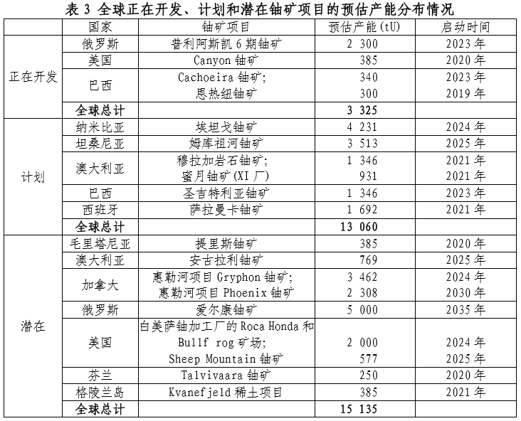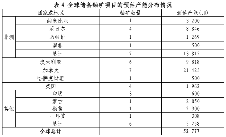由于资源枯竭,预计将有几座铀矿在21世纪20年代末关闭,这将需要通过重启闲置产能或启动新项目来代替关闭的产能。无论是在参考、高需求量或低需求量情景下,从长远来看,核工业都需要在2040年前将其现有、闲置、正在开发、计划和潜在项目的基础设施至少翻一番。显然,目前的扩展项目、铀资源和储备项目足以满足这一目标。表1和表2分别是截至2018年年底全球现有铀矿项目、闲置铀矿项目的产能分布情况;表3和表4分别是对全球正在开发、计划和潜在铀矿项目以及储备项目的预估产能分布情况。
